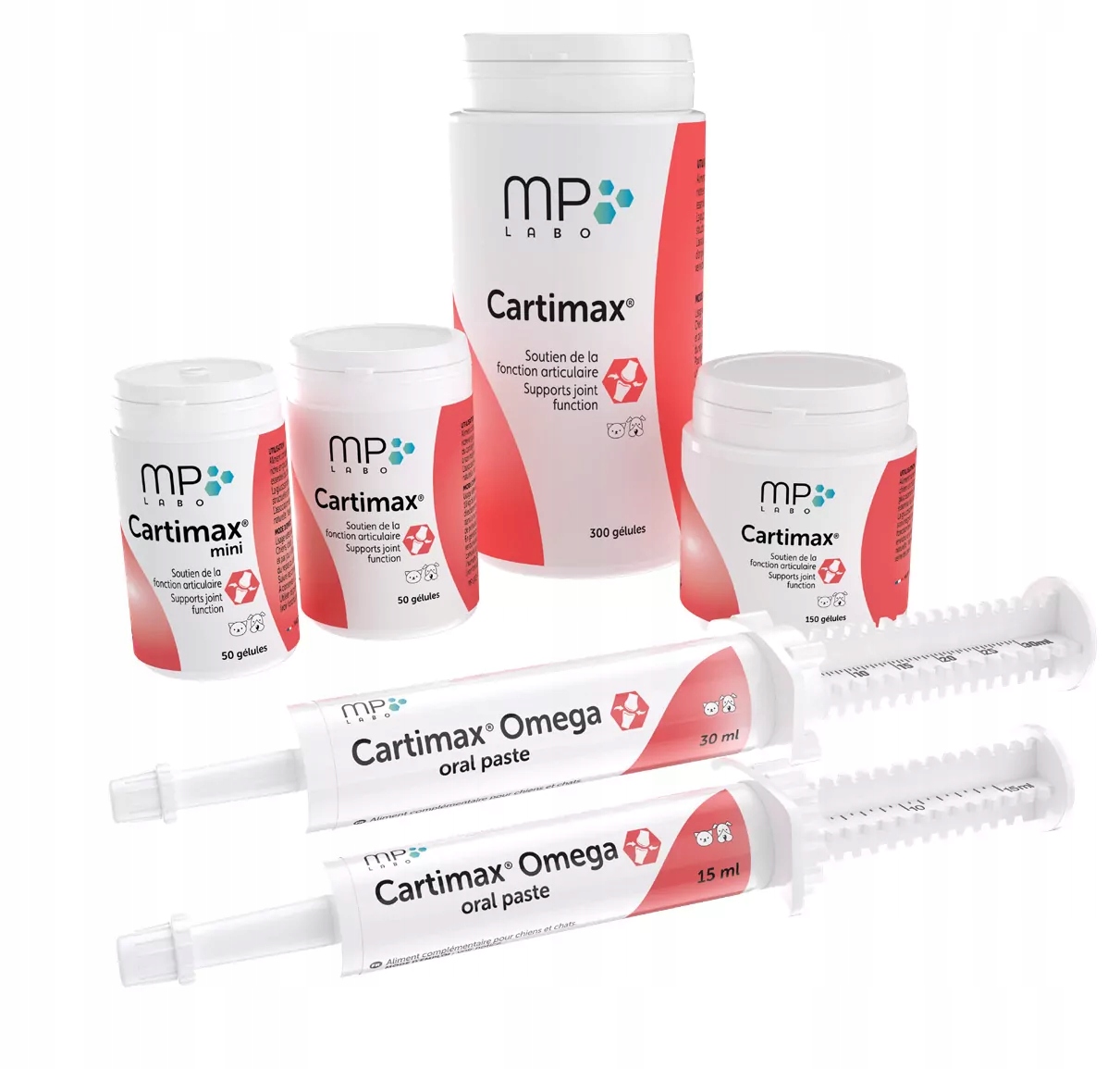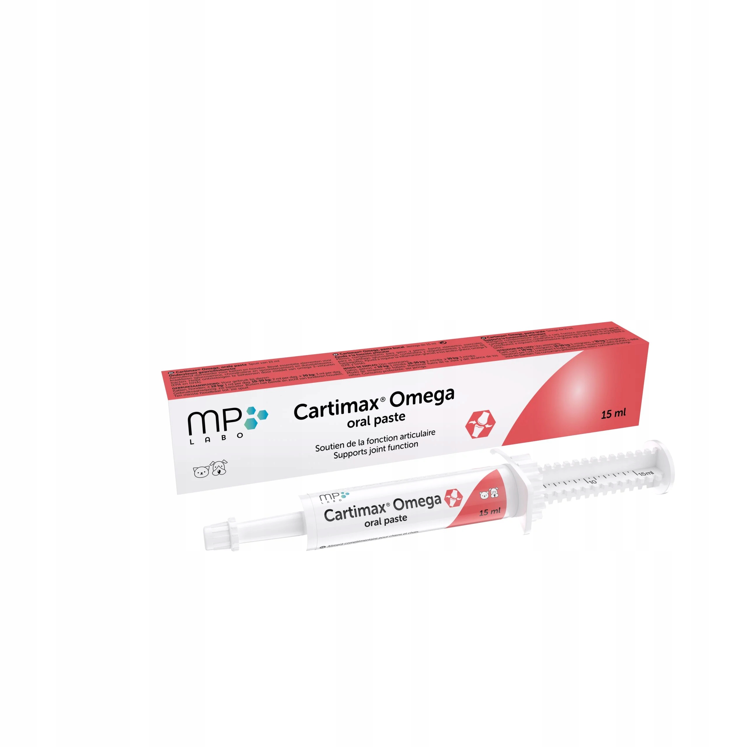 Cartimax Omega to suplement diety w postaci pasty przeznaczony do wspomagania stawów. Jego skład glukozaminy i ekstraktów roślinnych ogranicza rozpad chrząstki (chondroprotektory). Jego naturalne działanie przeciwzapalne nie ma skutków ubocznych i jest odpowiednie dla starszych zwierząt cierpiących na artrozę i młodych zwierząt z problemami układu ruchu.